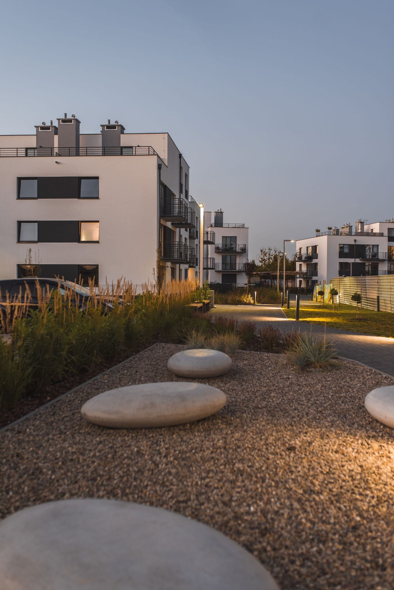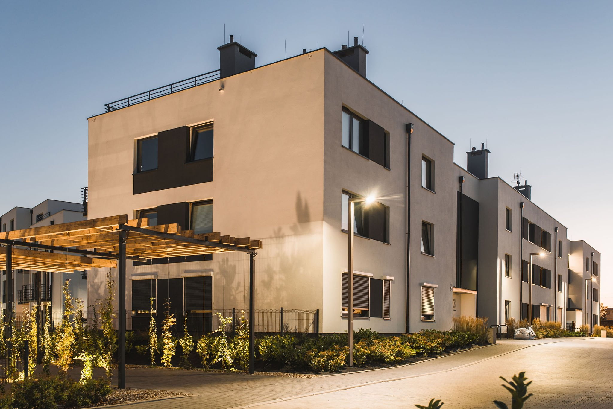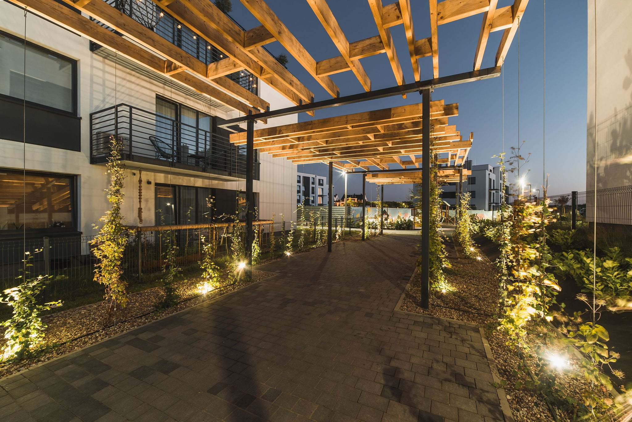 Many green areas with elements of small architecture have been created within the estate, including a promenade with a pergola and green walls. Eco-friendly solutions have also been planned, such as bike racks, LED lighting, and the use of rainwater.